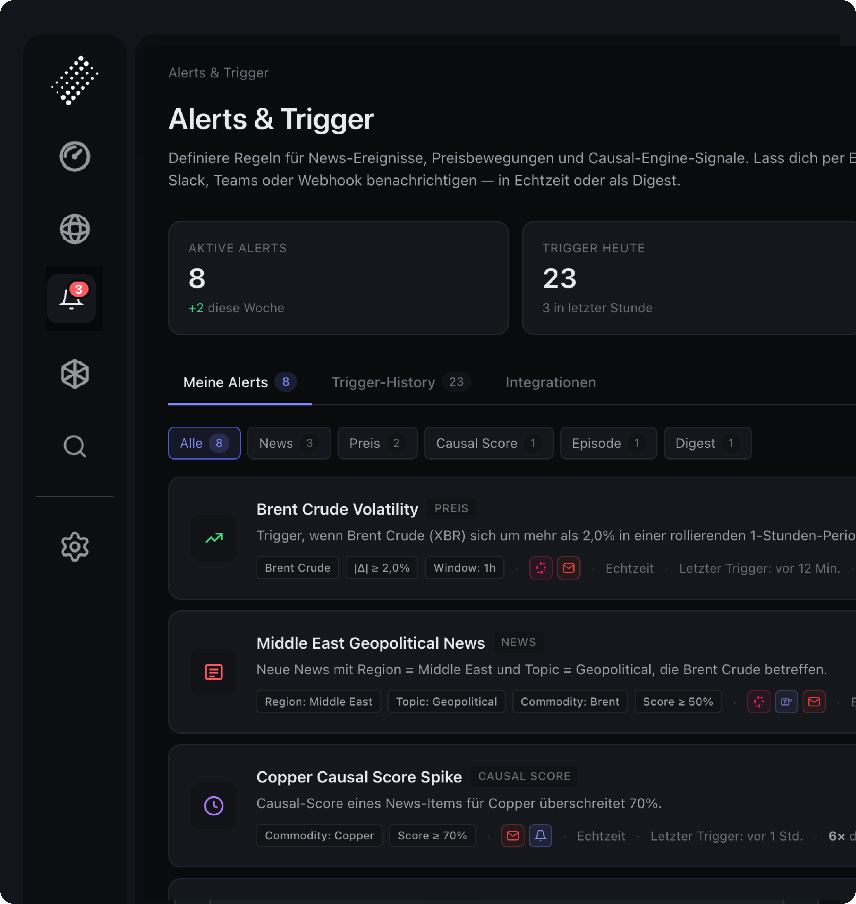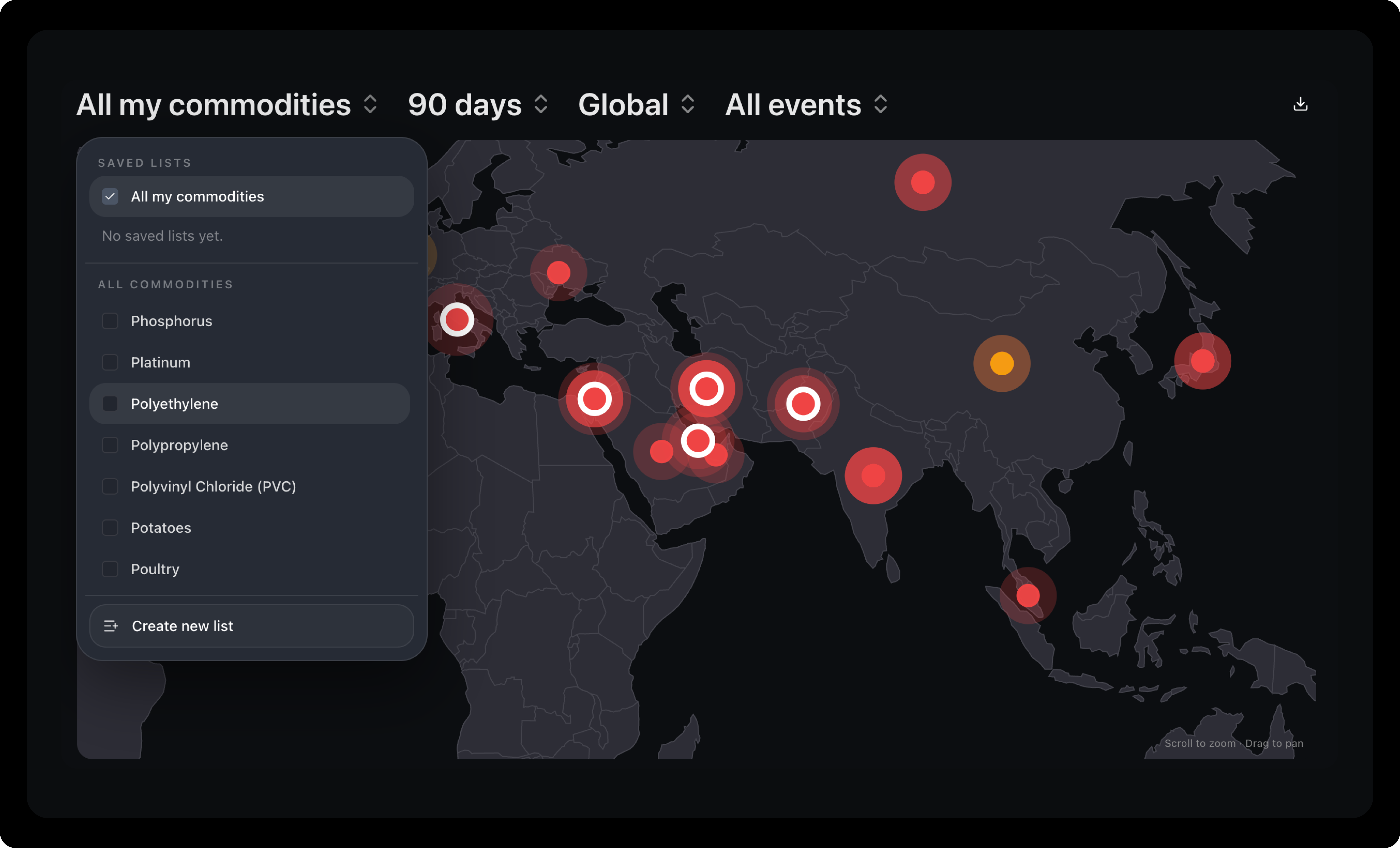 Track what impacts your positions — Monitor specific commodities, regions, or event types and receive updates when new developments emerge that could influence your market exposure.