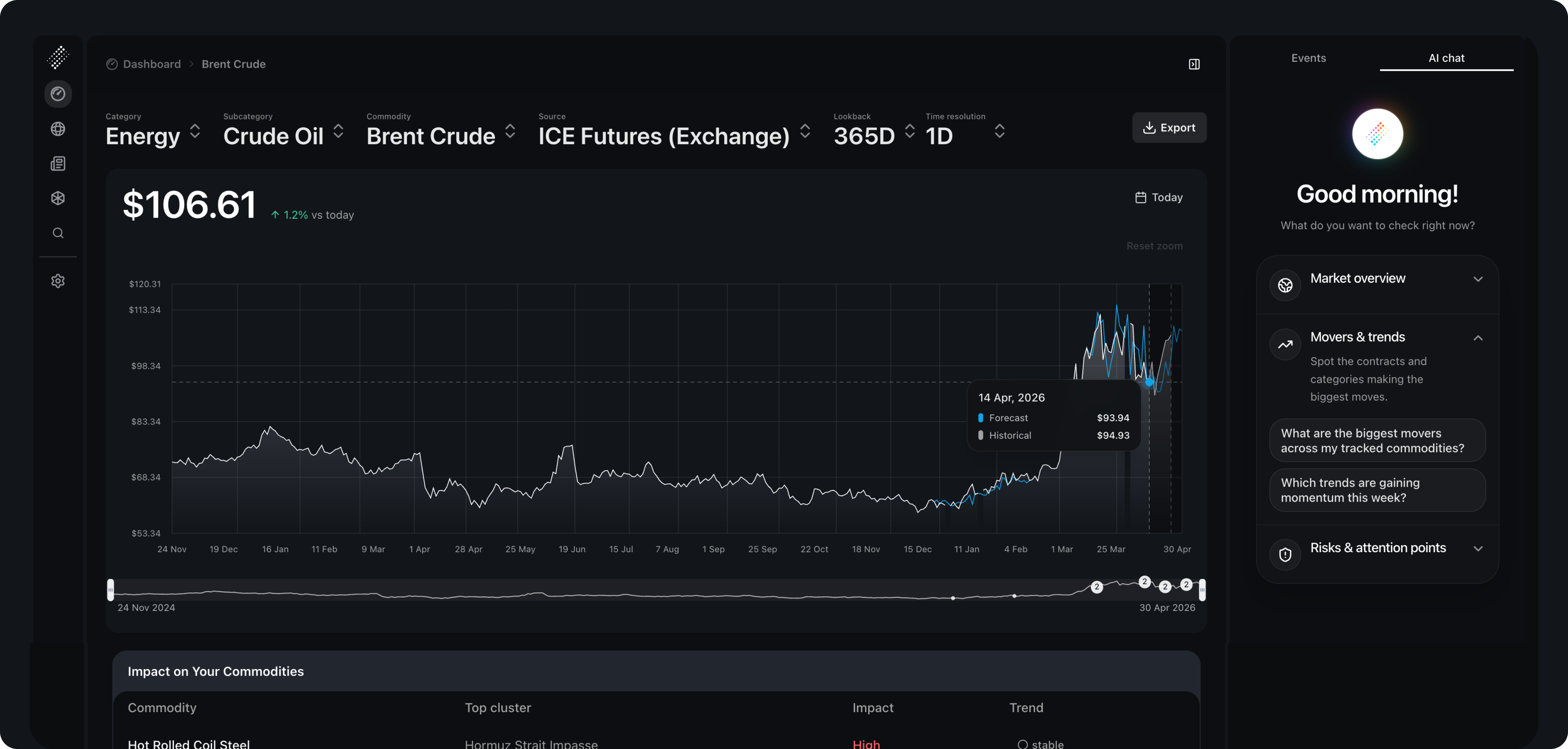 Analyze market signals, identify price drivers, and generate AI-powered commodity forecasts — all in one platform.