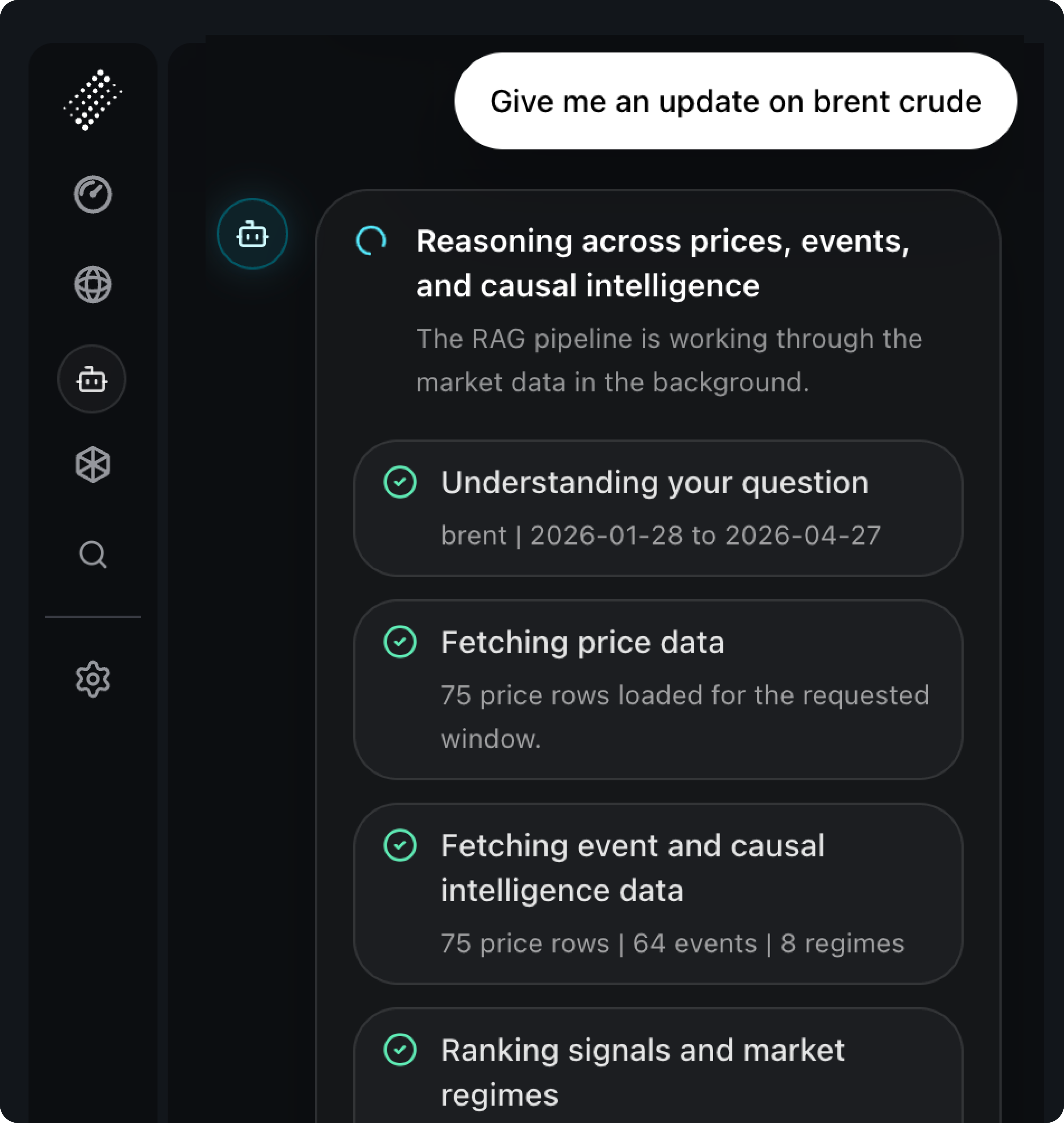 Ask questions the way you think — Interact with the platform using plain language from simple price checks to complex market questions without needing to navigate multiple tools or datasets.